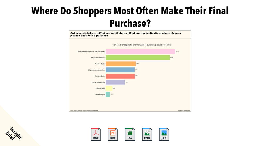 - 65% of shoppers finalize purchases through online marketplaces, while 60% prefer physical retail stores.